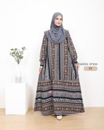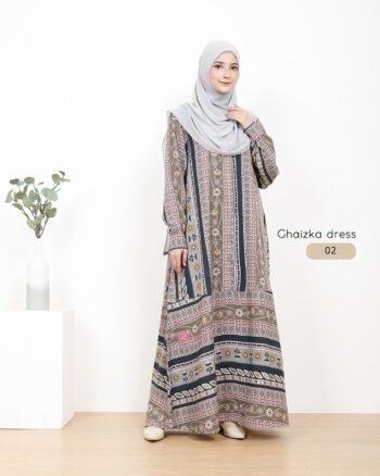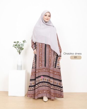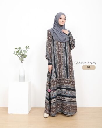Dress Ghaizka. Dress dengan motif etnik ini didesain dengan model longgar yang syar’i, karena cuttingnya ada di bagian roknya. Gamis dengan motif etnik floral dan geometris ini bisa kamu pakai untuk berbagai acara loh, tinggal kamu match-ing dengan jilbab/khimar koleksi kalian. Yuk order~